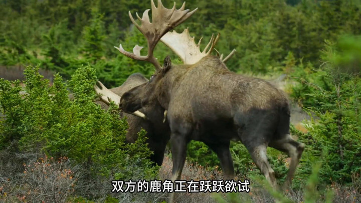 雌鹿在一旁观战,双方的鹿角正在跃跃欲试。战斗顷刻间打响,它们边怒吼边低下头颅,同时使用鹿角撞击对方。这种激烈的搏斗容易对它们的鹿角造成严重伤害。打斗才刚开始,双方都还保留着实力。然而每一次的鹿角碰撞,其产生的撞击声足以看出它们打斗的激烈程度。